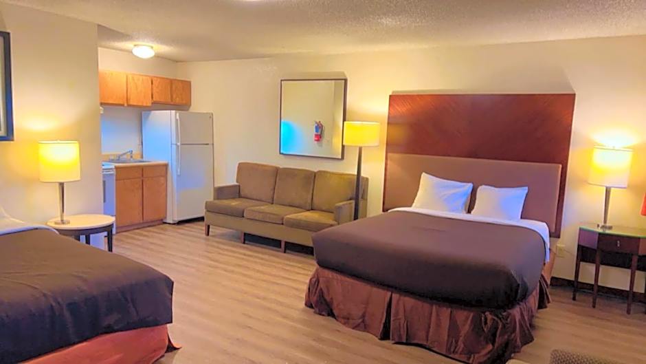 The suite's kitchen is available for cooking and storing food. The suite is furnished with a desk and a seating area.